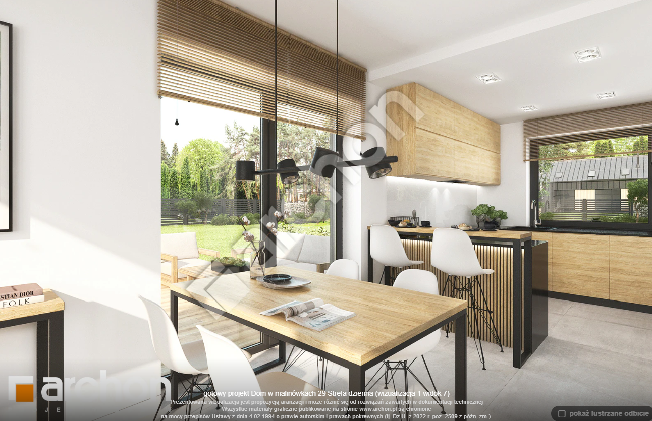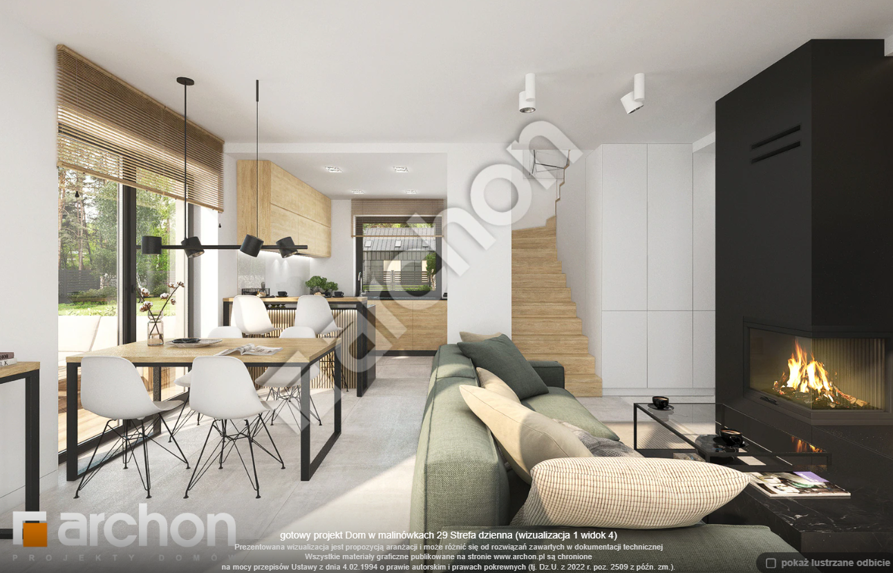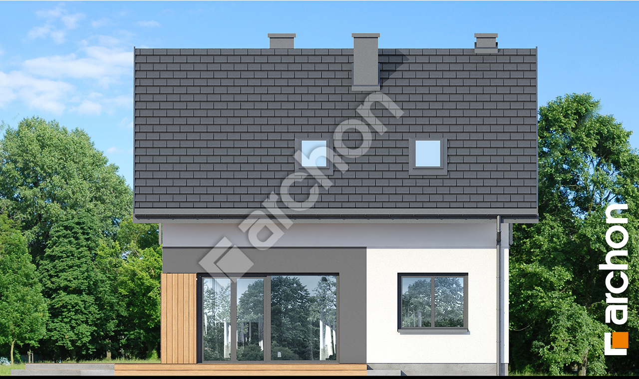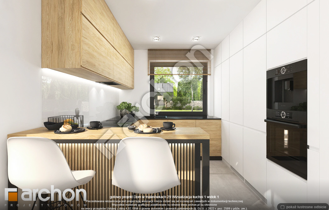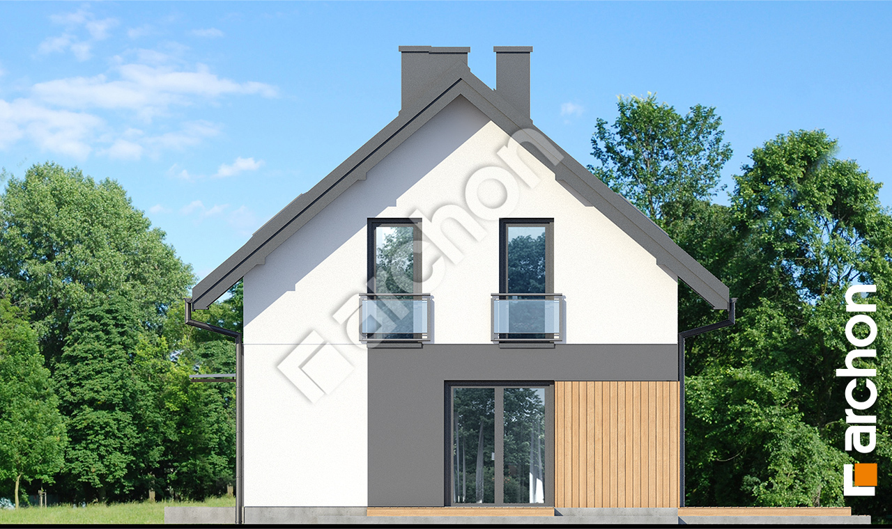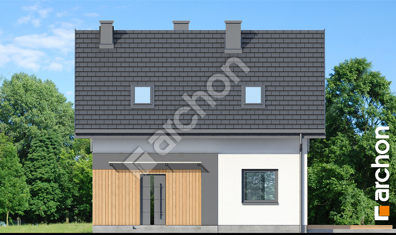 Atrakcyjnie zaprojektowana elewacja łączy w sobie białą bazę jasnego tynku z elementami szarości, a zwieńczeniem wizualnego efektu jest naturalna okładzina drewniana przy wejściu głównym oraz od strony ogrodu. Antracytowa płaska dachówka, portfenetry i uroczy taras z pergolą zachowują elegancki i nowoczesny charakter domu. Główne wejście osłonięte praktycznym zadaszeniem wprowadza nas do wiatrołapu z garderobą. Strefa dzienna to otwarta przestrzeń, w której salon z wyjściem na zewnętrzną strefę wypoczynku łączy się z jadalnią, w której przewidziano wygodny stół dla rodziny. W pobliżu kuchni znajduje się drugie wyjście na taras, gdzie można zaaranżować kącik kawowy. W kuchni zaprojektowano duże okno, zapewniające dobre naturalne doświetlenie, co zwiększa wygodę podczas pracy. Po przeciwnej stronie parteru mieści się gabinet, mogący pełnić funkcję pokoju gościnnego oraz łazienka z nowoczesnym prysznicem. Kotłownia posiada wejście z wiatrołapu i daje możliwość organizacji pralni. Prywatna część domowników, zaprojektowana na poddaszu, obejmuje trzy wygodne sypialnie z wystarczającą ilością miejsca na łóżka, biurka i szafy. Dopełnieniem programu użytkowego strefy nocnej jest komfortowa łazienka z wanną i prysznicem.