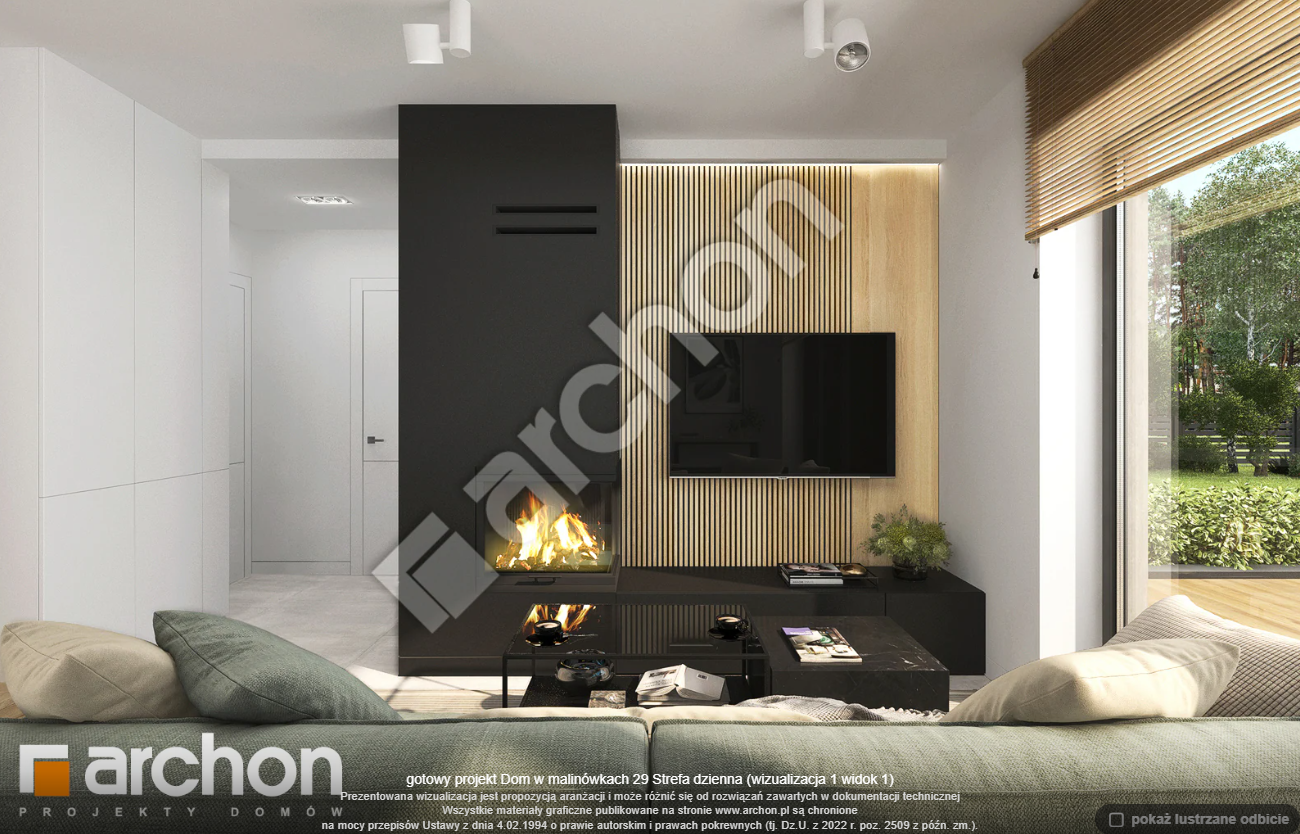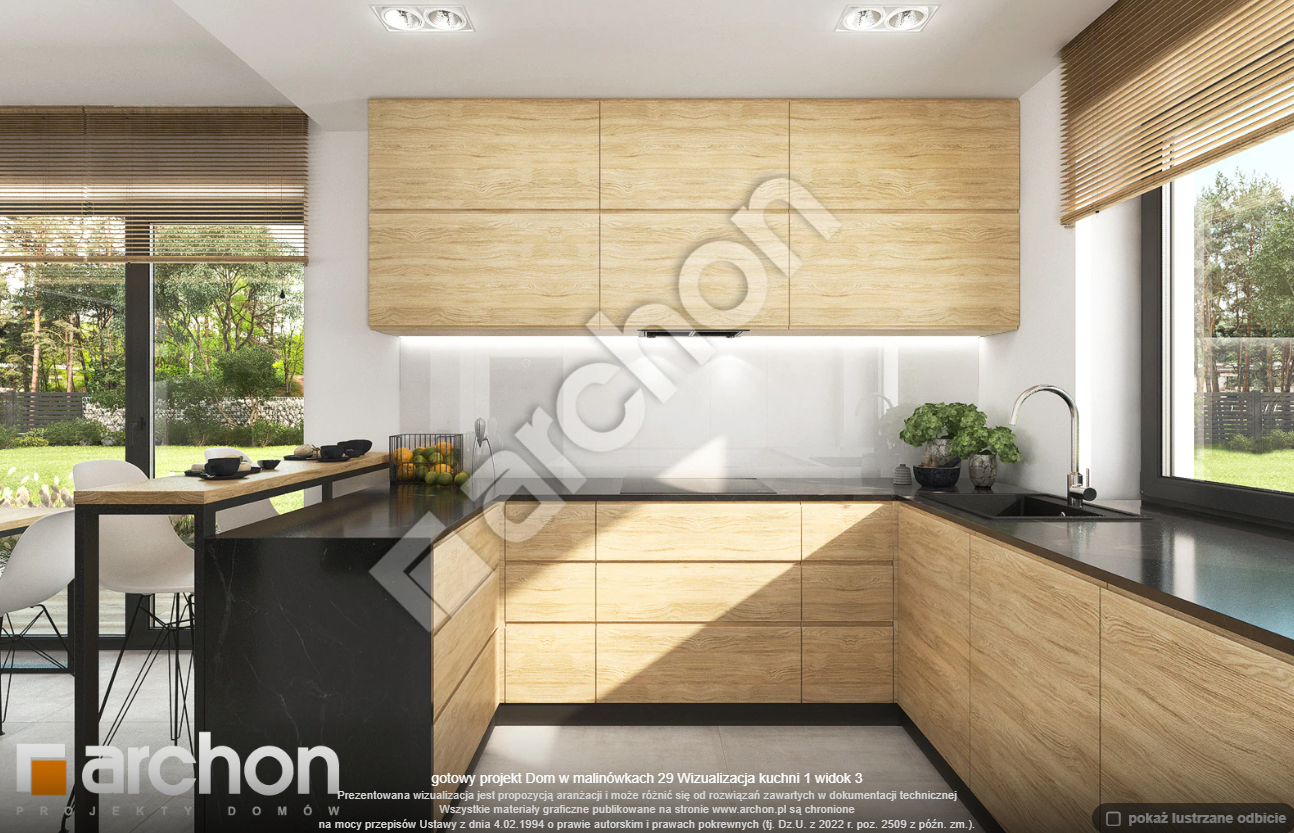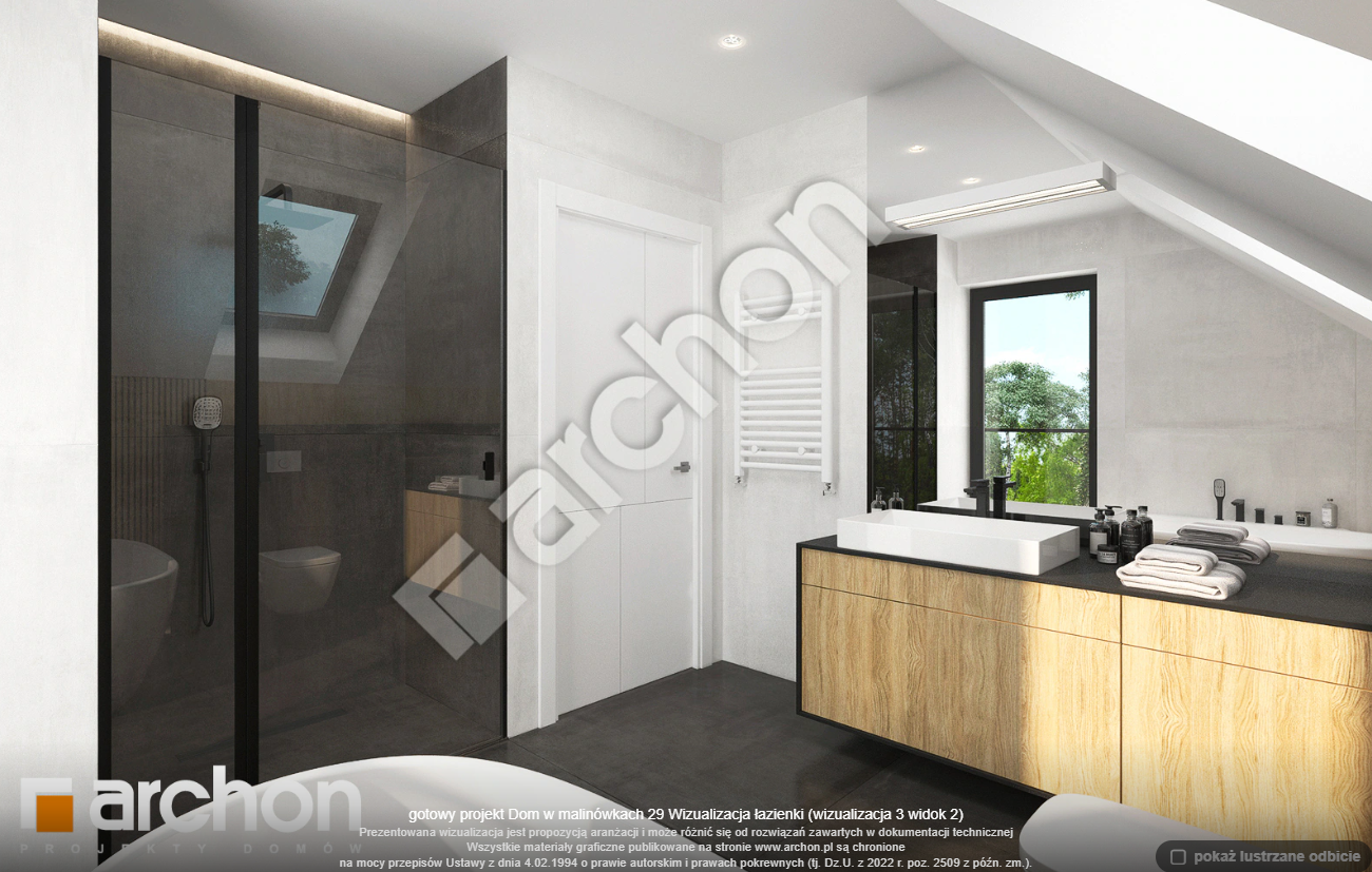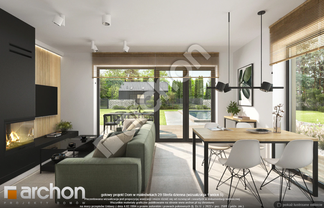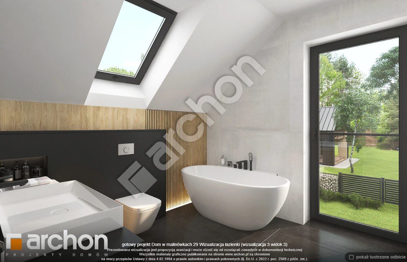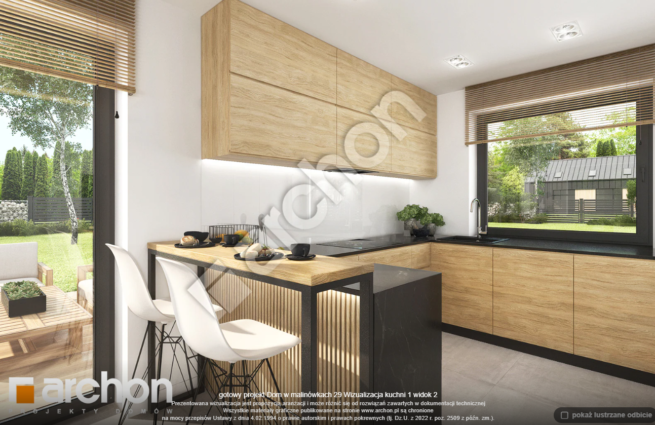 Atrakcyjnie zaprojektowana elewacja łączy w sobie białą bazę jasnego tynku z elementami szarości, a zwieńczeniem wizualnego efektu jest naturalna okładzina drewniana przy wejściu głównym oraz od strony ogrodu. Antracytowa płaska dachówka, portfenetry i uroczy taras z pergolą zachowują elegancki i nowoczesny charakter domu. Główne wejście osłonięte praktycznym zadaszeniem wprowadza nas do wiatrołapu z garderobą. Strefa dzienna to otwarta przestrzeń, w której salon z wyjściem na zewnętrzną strefę wypoczynku łączy się z jadalnią, w której przewidziano wygodny stół dla rodziny. W pobliżu kuchni znajduje się drugie wyjście na taras, gdzie można zaaranżować kącik kawowy. W kuchni zaprojektowano duże okno, zapewniające dobre naturalne doświetlenie, co zwiększa wygodę podczas pracy. Po przeciwnej stronie parteru mieści się gabinet, mogący pełnić funkcję pokoju gościnnego oraz łazienka z nowoczesnym prysznicem. Kotłownia posiada wejście z wiatrołapu i daje możliwość organizacji pralni. Prywatna część domowników, zaprojektowana na poddaszu, obejmuje trzy wygodne sypialnie z wystarczającą ilością miejsca na łóżka, biurka i szafy. Dopełnieniem programu użytkowego strefy nocnej jest komfortowa łazienka z wanną i prysznicem.