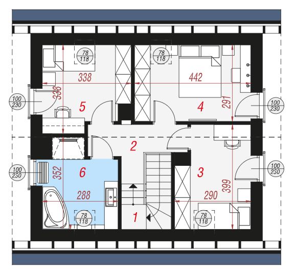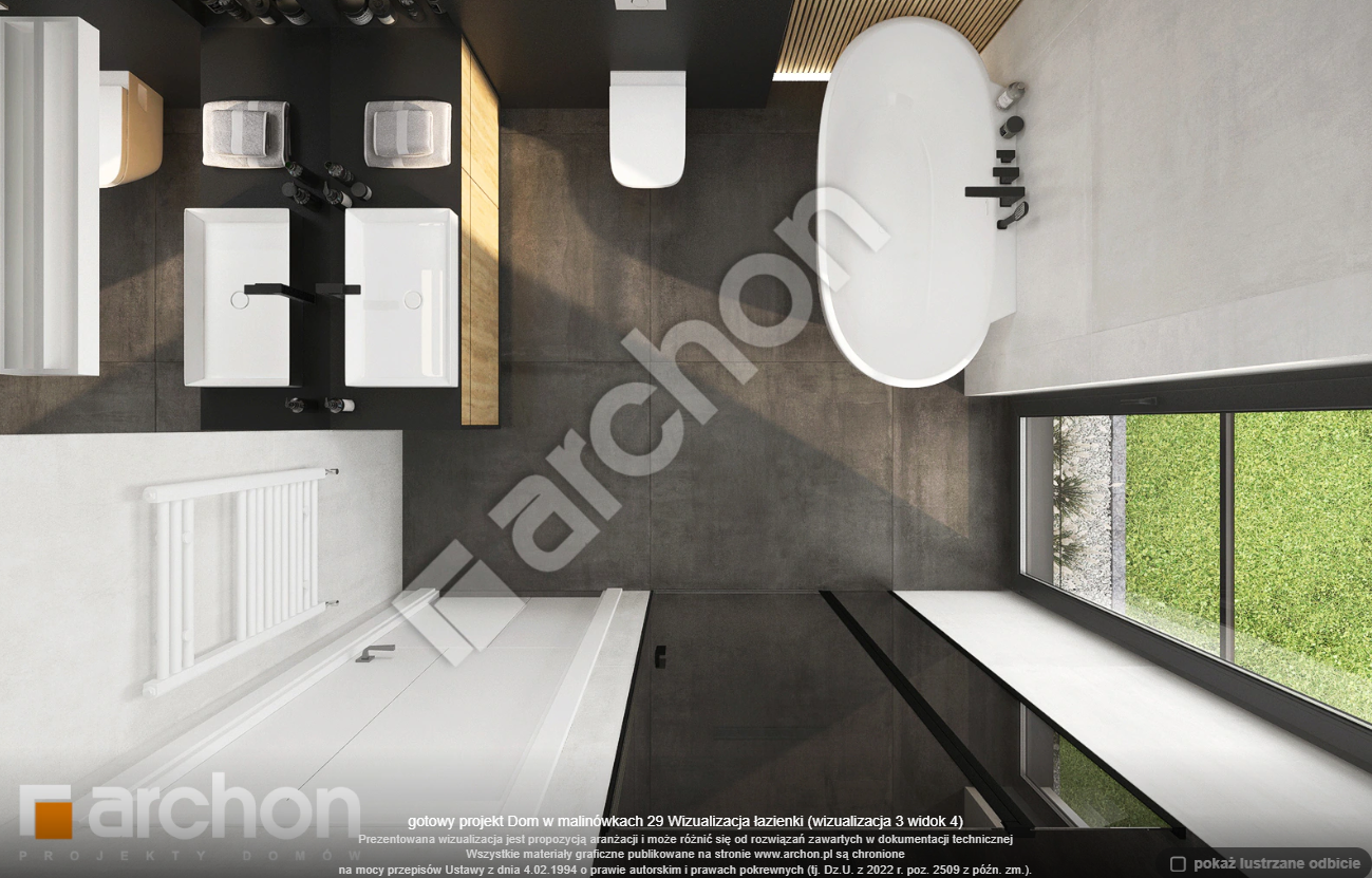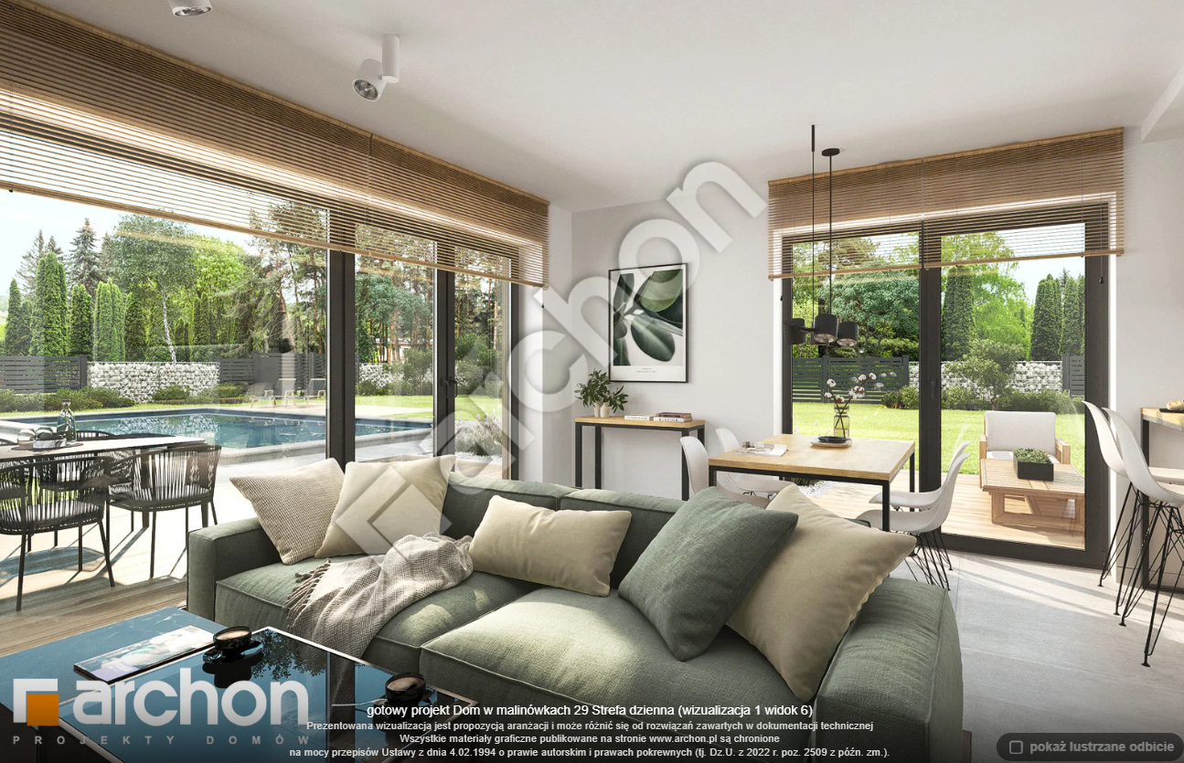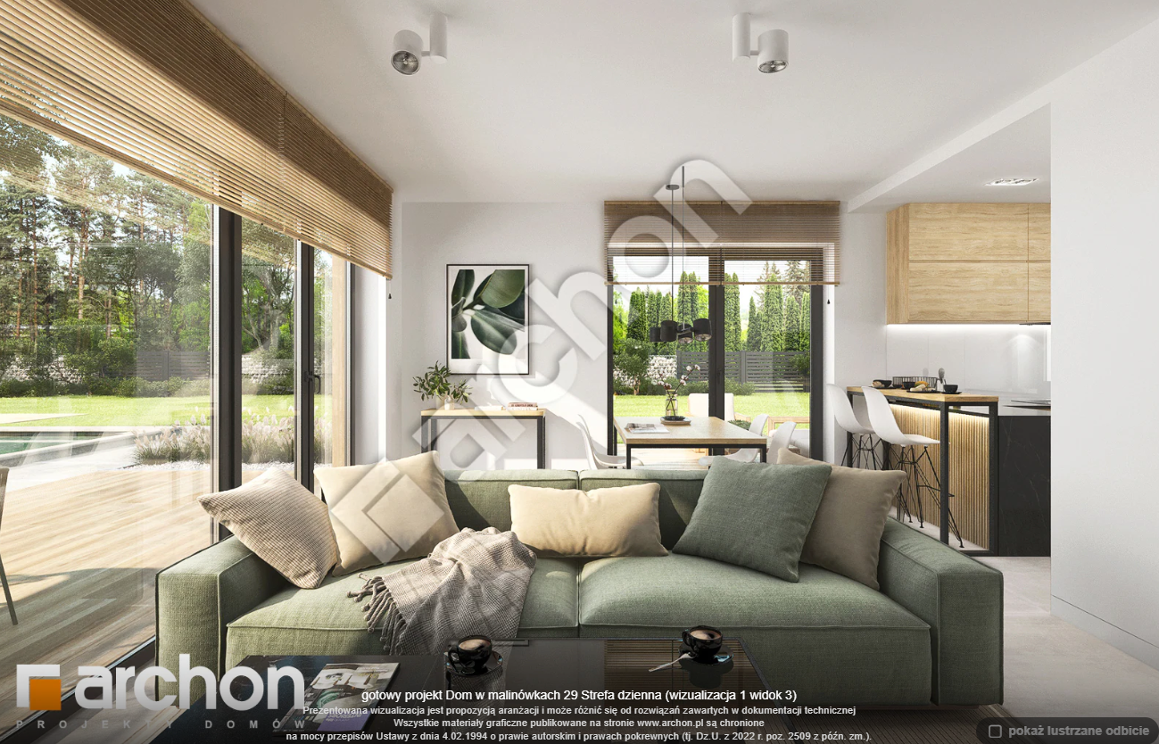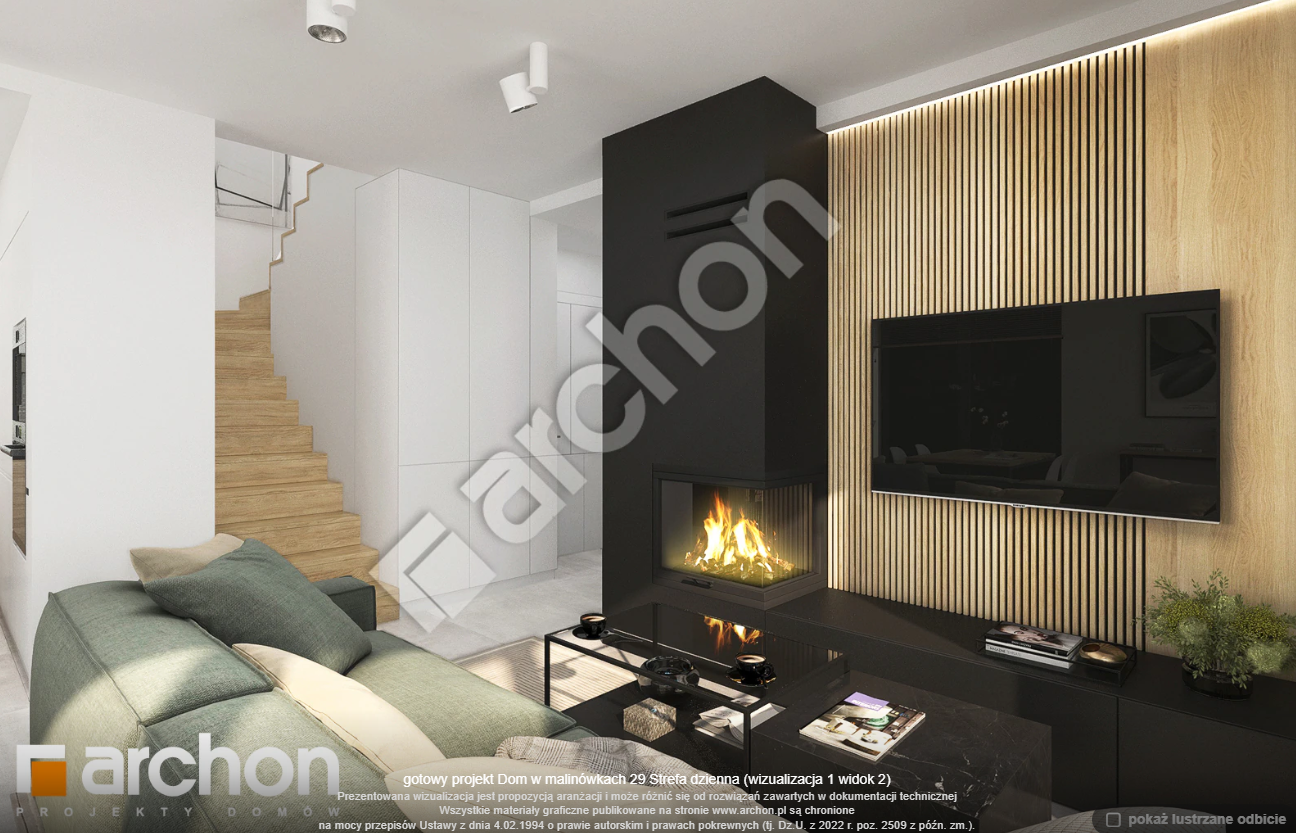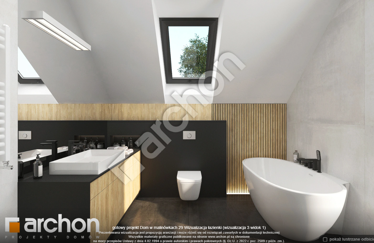 Atrakcyjnie zaprojektowana elewacja łączy w sobie białą bazę jasnego tynku z elementami szarości, a zwieńczeniem wizualnego efektu jest naturalna okładzina drewniana przy wejściu głównym oraz od strony ogrodu. Antracytowa płaska dachówka, portfenetry i uroczy taras z pergolą zachowują elegancki i nowoczesny charakter domu. Główne wejście osłonięte praktycznym zadaszeniem wprowadza nas do wiatrołapu z garderobą. Strefa dzienna to otwarta przestrzeń, w której salon z wyjściem na zewnętrzną strefę wypoczynku łączy się z jadalnią, w której przewidziano wygodny stół dla rodziny. W pobliżu kuchni znajduje się drugie wyjście na taras, gdzie można zaaranżować kącik kawowy. W kuchni zaprojektowano duże okno, zapewniające dobre naturalne doświetlenie, co zwiększa wygodę podczas pracy. Po przeciwnej stronie parteru mieści się gabinet, mogący pełnić funkcję pokoju gościnnego oraz łazienka z nowoczesnym prysznicem. Kotłownia posiada wejście z wiatrołapu i daje możliwość organizacji pralni. Prywatna część domowników, zaprojektowana na poddaszu, obejmuje trzy wygodne sypialnie z wystarczającą ilością miejsca na łóżka, biurka i szafy. Dopełnieniem programu użytkowego strefy nocnej jest komfortowa łazienka z wanną i prysznicem.
